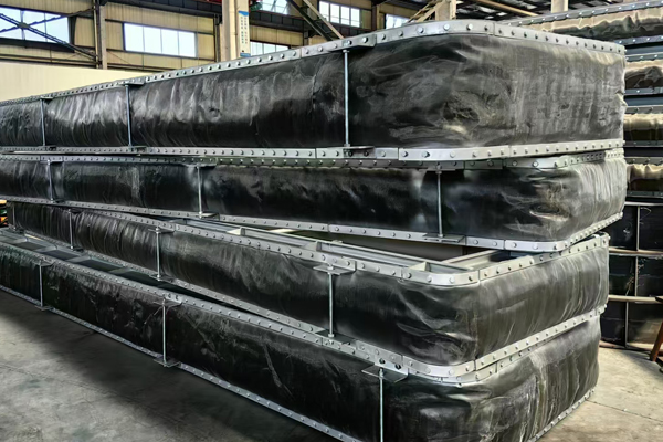 本文中所展示的圖片是我們翔盛環(huán)保科技公司近期正在為山東客戶生產(chǎn)制作的一批矩形非金屬補償器(矩形非金屬膨脹節(jié))。非金屬補償器通常由纖維織物蒙皮(硅膠為紅色、氟膠為黑色)與管道接口形狀相同的金屬框架、以及其它的結構件所組成。